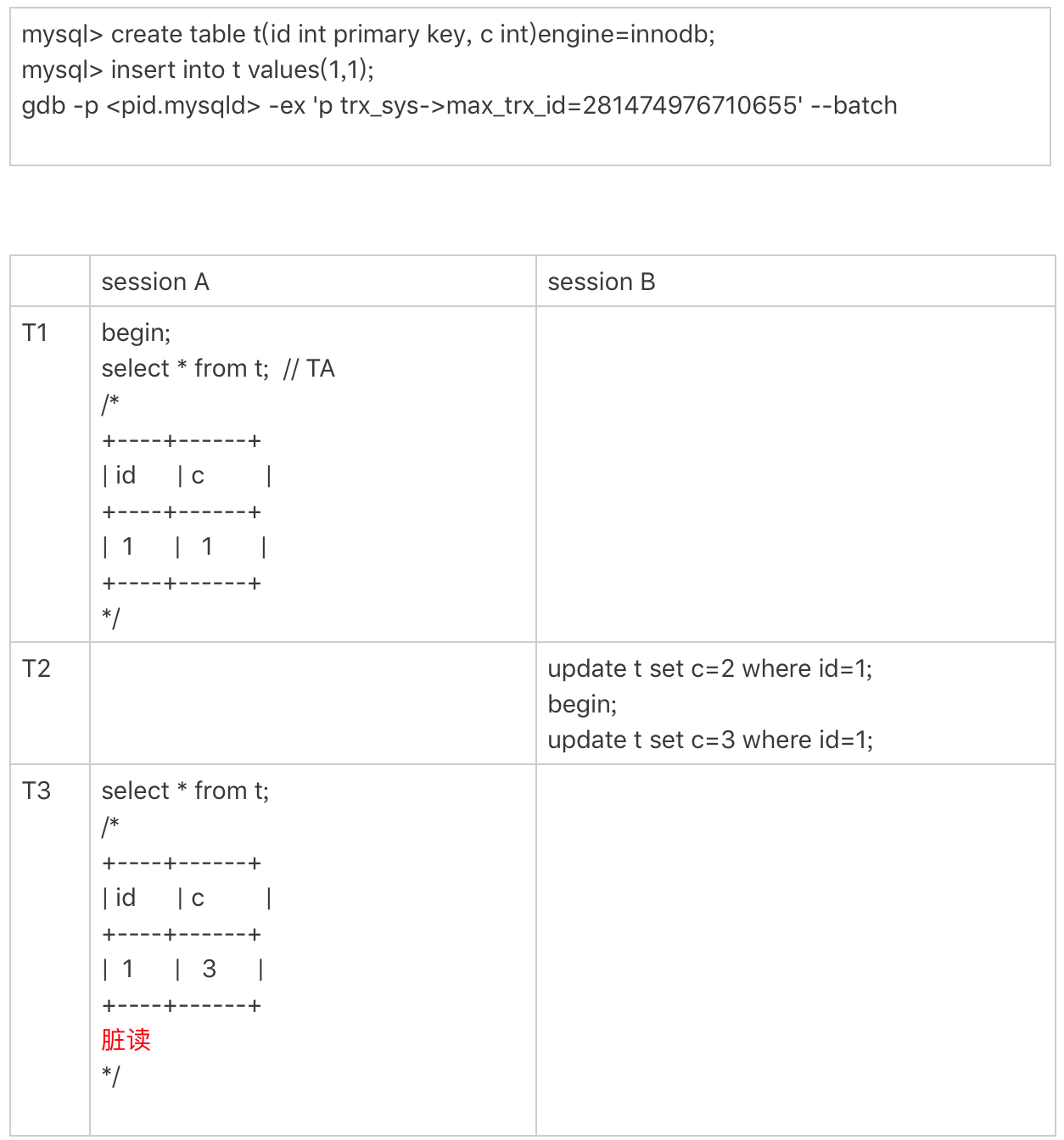 - InnoDB 的 max_trx_id 递增值每次 MySQL 重启都会被保存起来,脏读的例子就是一个必现的 bug。